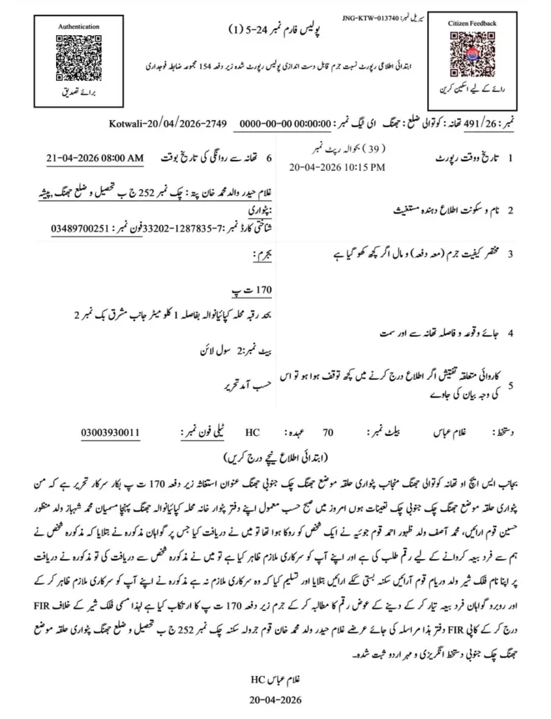 اسسٹنٹ کمشنر جھنگ رب نواز چدھڑ نے عوام سے اپیل کی ہے کہ اگر کسی بھی پٹوار خانے میں کوئی غیر متعلقہ یا پرائیویٹ شخص سرکاری امور انجام دیتا نظر آئے تو فوری طور پر انتظامیہ کو اطلاع دی جائے تاکہ شفاف اور میرٹ پر مبنی نظام کو یقینی بنایا جا سکے۔