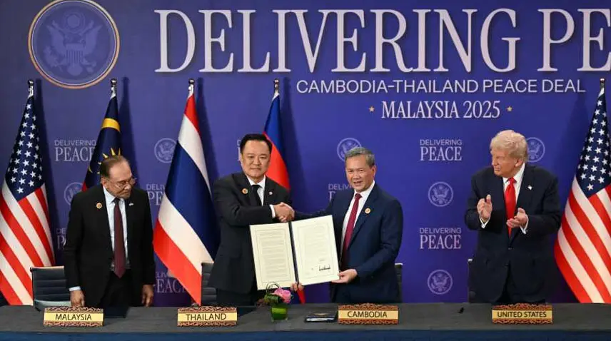 تھائی لینڈ اور کمبوڈیا نے ملائیشیا کے دارالحکومت کوالالمپور میں اتوار کے روز آسیان سربراہی اجلاس کے موقع پر سرحدی تنازعات کو حل کرنے کے لیے ایک امن معاہدے پر دستخط کیے ۔ امریکی صدر ڈونلڈ ٹرمپ نے “امن معاہدے” کی تقریب کی صدارت کی۔ اس سے قبل دونوں ممالک نے اس سال جولائی میں