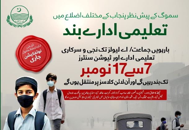 سموگ کے پیش نظر پنجاب کے مختلف اضلاع میں تعلیمی ادارے بند۔ ڈی جی ادارہ تحفظ ماحول، ڈاکٹر عمران حامد شیخ کی جانب سے نوٹیفکیشن جاری۔بارہویں جماعت/ اے لیولز تک نجی و سرکاری تعلیمی ادارےاور ٹیوشن سنٹرز 7 سے 17 نومبر تک بند رہیں گے اور آن لائن کلاسز پر منتقل ہوں گے۔لاہور ، قصور،