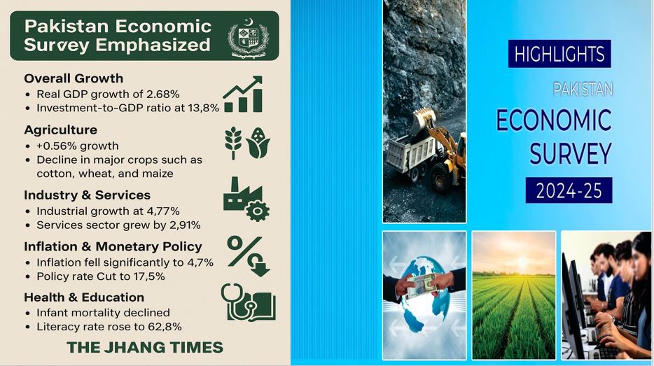 اسلام آباد (دی جھنگ ٹائمز) گزشتہ روز وفاقی وزیر خزانہ محمد اورنگزیب نے حکومتِ پاکستان کے مالی سال 2024-25 کے لیے اقتصادی جائزہ جاری کر دیا ہے، جس میں معیشت کے مختلف شعبوں میں قابلِ ذکر بہتری کے ساتھ ساتھ کچھ سنجیدہ چیلنجز کی بھی نشاندہی کی گئی ہے۔ رپورٹ کے مطابق زراعت اور صنعت کے شعبے اب بھی دباؤ کا شکار ہیں، تاہم مجموعی طور پر معاشی اشاریے بہتری کی جانب گامزن ہیں۔