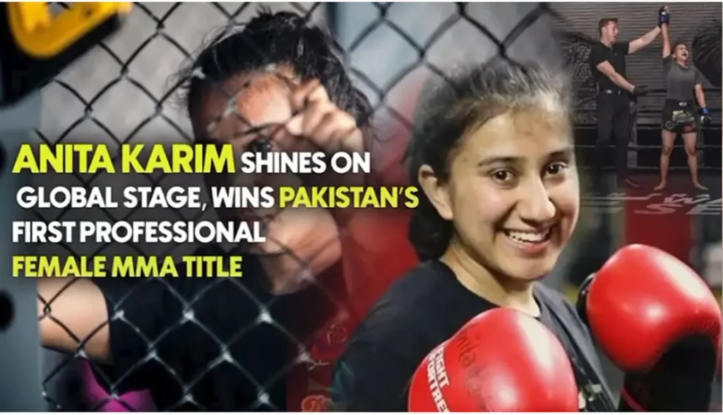 پاکستان کی بیٹی اور پہلی پروفیشنل ویمن ایم ایم اے فائٹر انیتا کریم نے شاندار کارکردگی کا مظاہرہ کرتے ہوئے دنیا بھر میں پاکستان کا نام روشن کر دیا ہے۔ انیتا کریم نے پاکستان میں خواتین کی پہلی پروفیشنل ایم ایم اے فائٹ کا ٹائٹل اپنے نام کر کے تاریخ رقم کر دی۔