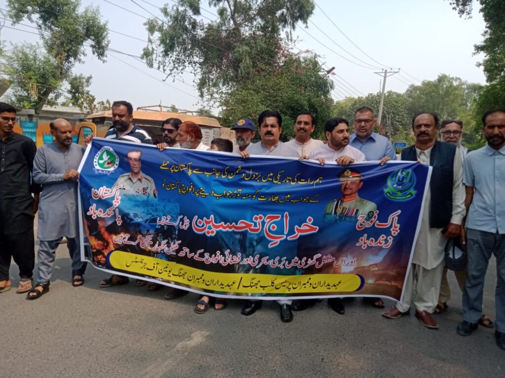 پاک بھارت حالیہ کشیدگی کے تناظر میں افواج پاکستان سے اظہار یکجہتی کے لئے پریس کلب جھنگ اور یونین آف جرنلسٹس جھنگ کے زیر اہتمام ریلی کا اہتمام کیا گیا۔پریس کلب سے نکالی جانے والی ریلی کی قیادت یونین آف جرنلسٹس کے صدر شریف طاہر اور سیکرٹری پریس کلب خرم سعید نے کی جبکہ بڑی تعداد میں الیکٹرانک اور پرنٹ میڈیا سے تعلق رکھنے والے صحافیوں نے ریلی میں شرکت کی۔ اس موقع پرریلی کے شرکاءسے خطاب کرتے ہوئے صدر یونین آف جرنلسٹس شریف طاہر نے کہا کہ بزدل دشمن بھارت نے رات کی تاریکی میں پاکستان کی سویلین آبادی پر حملہ کر کے پاکستان کی سالمیت کو للکارا جس کے جواب میں افواج پاکستان نے دشمن کو فوری منہ توڑ جواب دیا اور بھر پور کارروائیاں کرتے ہوئے نہ صرف ان کے تین رافیل طیاروں سمیت پانچ جنگی طیارے گرائے بلکہ بھارت کی متعدد چوکیاں بھی تباہ کیں۔ سیکرٹری پریس کلب خرم سعید نے کہا کہ جھنگ کے صحافی اپنی افواج سے بھر پور اظہار یکجہتی کرتے ہیں اور اس عزم کا اظہار کرتے ہیں کہ ملکی دفاع کے لئے جب بھی افواج پاکستان اور ملکی اداروں کو ضرورت پڑی تو صحافی ان کے شانہ بشانہ کھڑے ہوں گے