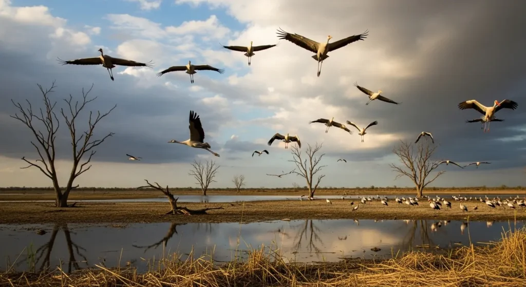 مہاجر آبی پرندے جیسے ڈالمیشین پیلیکن، بلیک ہیڈڈ آئیبس، اور پینٹڈ سٹارک کی آبادی میں کمی کی ایک بڑی وجہ مسکن کا نقصان اور حد سے زیادہ شکار بھی ہے۔ یہاں یہ سمجھنا ضروری ہے کہ موسمیاتی دباؤ اور شکار کس طرح ایک دوسرے کو تقویت دیتے ہیں۔ شدید خشک سالی اور پانی کی کمی پرندوں کو قدرتی طور پر محدود اور بکھرے ہوئے گیلے علاقوں کی طرف متوجہ کرتی ہے۔